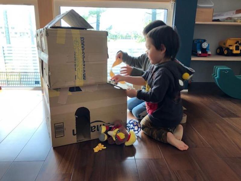 おうち時間にて 新築建築中。 金物は使わず、養生テープのみで接合の新工法。屋根がちょっと浮いてい...