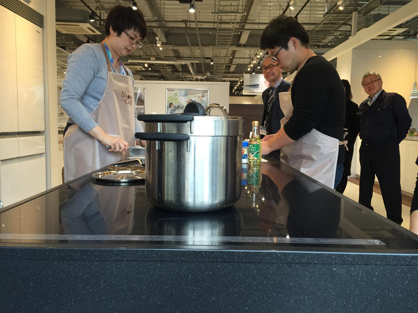 ショールーム内の説明では、新商品のダウンライトやお掃除不要のレンジフードなど魅力的な商品がたくさん