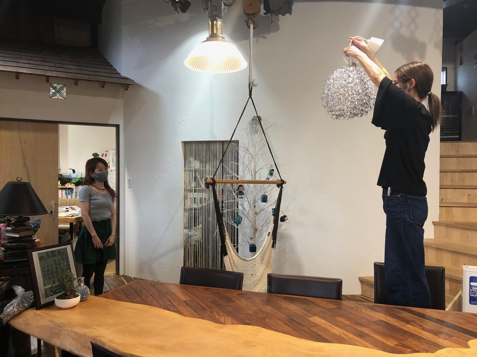 インテリア 2021-07-03 ミリ単位のこだわりです デザイナーがなにやら首かしげて考えてます 山田が持ってるのはなんとも素敵なペンダントライト どうやら高さの検討の様です 空間とのバランスを考えてるようですよ ミリ単位でこだわってます(いや、センチ単位かも) 来月の内見会でお目にかかれるかもです^^