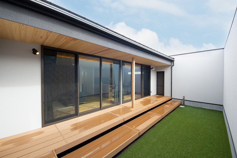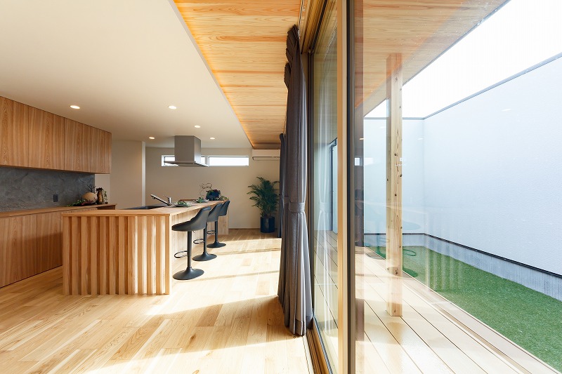 完成内見会 2022-03-19 極上の平屋 和モダン 先日はプライベートテラスのある平屋のお家の完成内見会を開催いたしました。 外壁はガルバリウム鋼板と吹付を組み合わせていますので同じブラックでも奥行のあるデザインとなっております(^^) キッチンから水回りをぐるっと回ることができる回遊動線も好評でした。 天井の羽目板がテラスに繋がりより広がりを感じます。 格子をデザインした美しいキッチン。 テラスを囲んだ間取りは家族が繋がる心地よい住まいです。