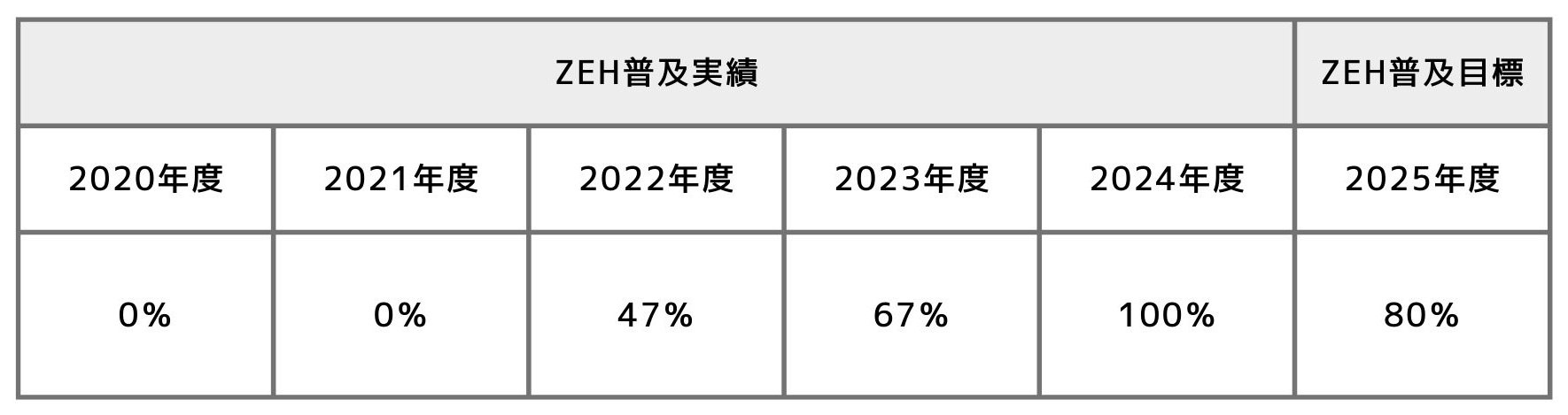 ニュース 2025-05-28 ZEH普及目標の公表について 総合建築アズ株式会社では、「ネット・ゼロ・エネルギー・ハウス補助事業」における「ZEHプランナー」登録申請を行い、ZEHの普及に取り組んでおります。 2024年度までのZEH普及実績および2025年度までのZEH普及目標を公表いたします。 ※年間建築棟数に対するZEHの割合です。 ※ZEHには「ZEH」「Nearly ZEH」「ZEH Oriented」を含みます。
