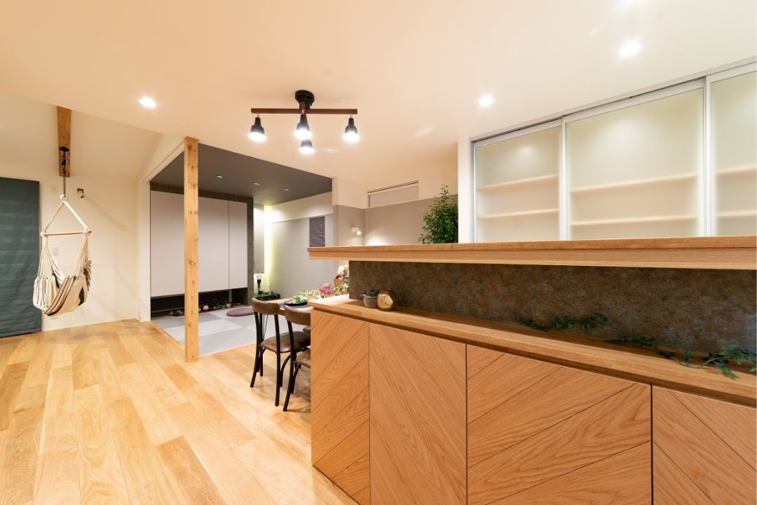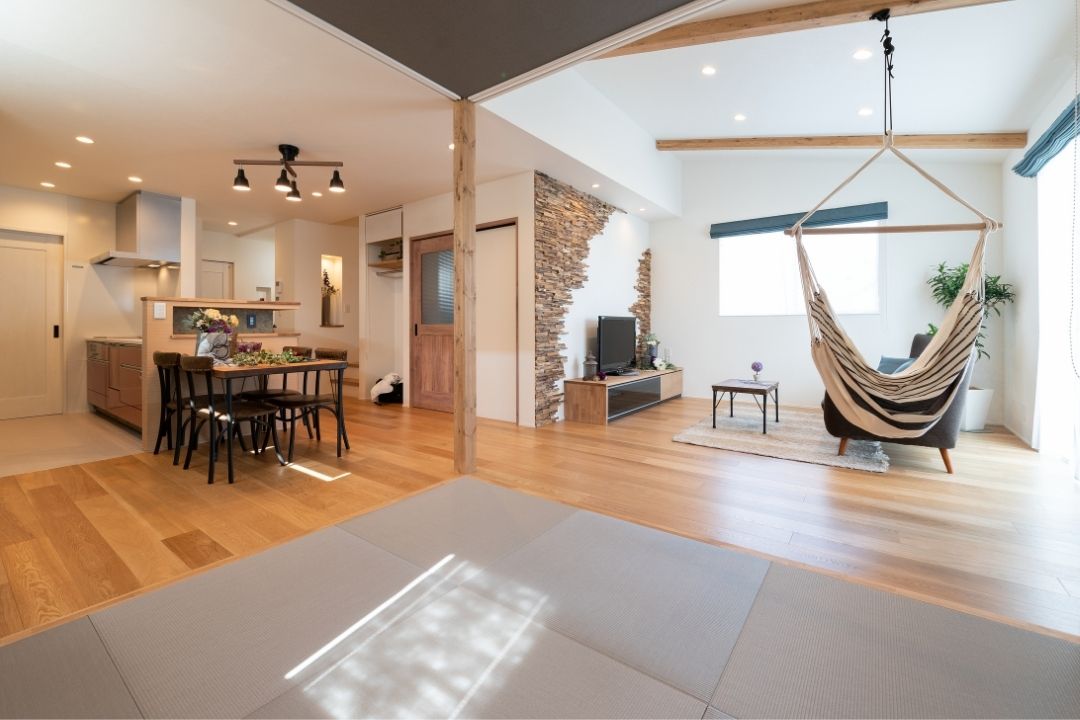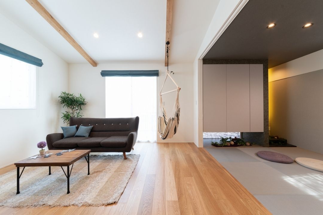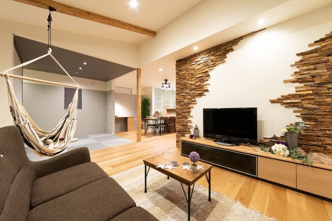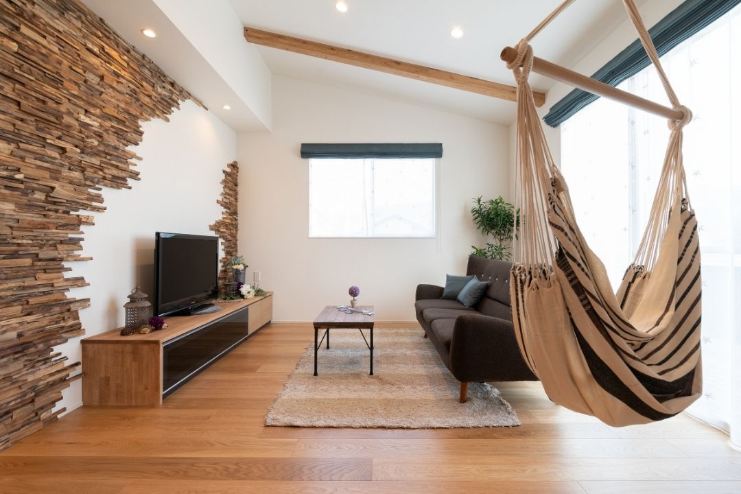 空間を活かした開放的なリビングに浮かぶハンモックは大人も子供も楽しめる。