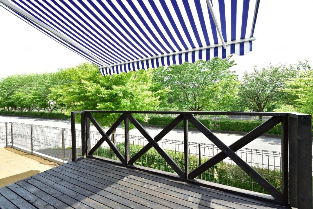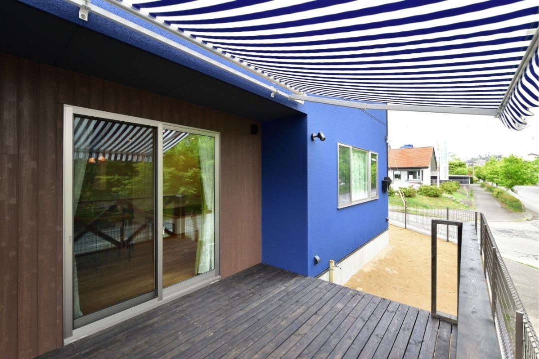 リビングに繋がるウッドデッキは使い勝手がいいシェード付きです。