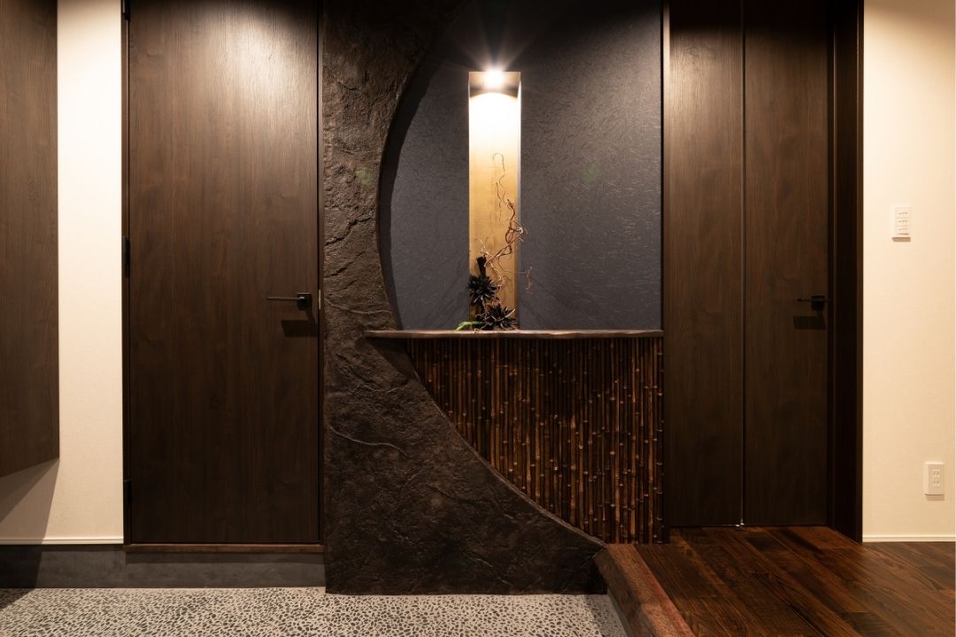 和の趣漂う玄関には、竹と造形モルタルを組み合わせ、品のある空間に。
