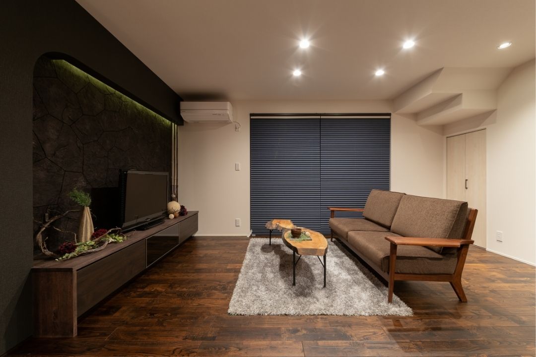 石の立体感と重厚感を表現した造作テレビボードが曲線に包まれ、和らぐデザインとなりました。
