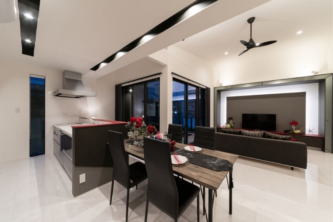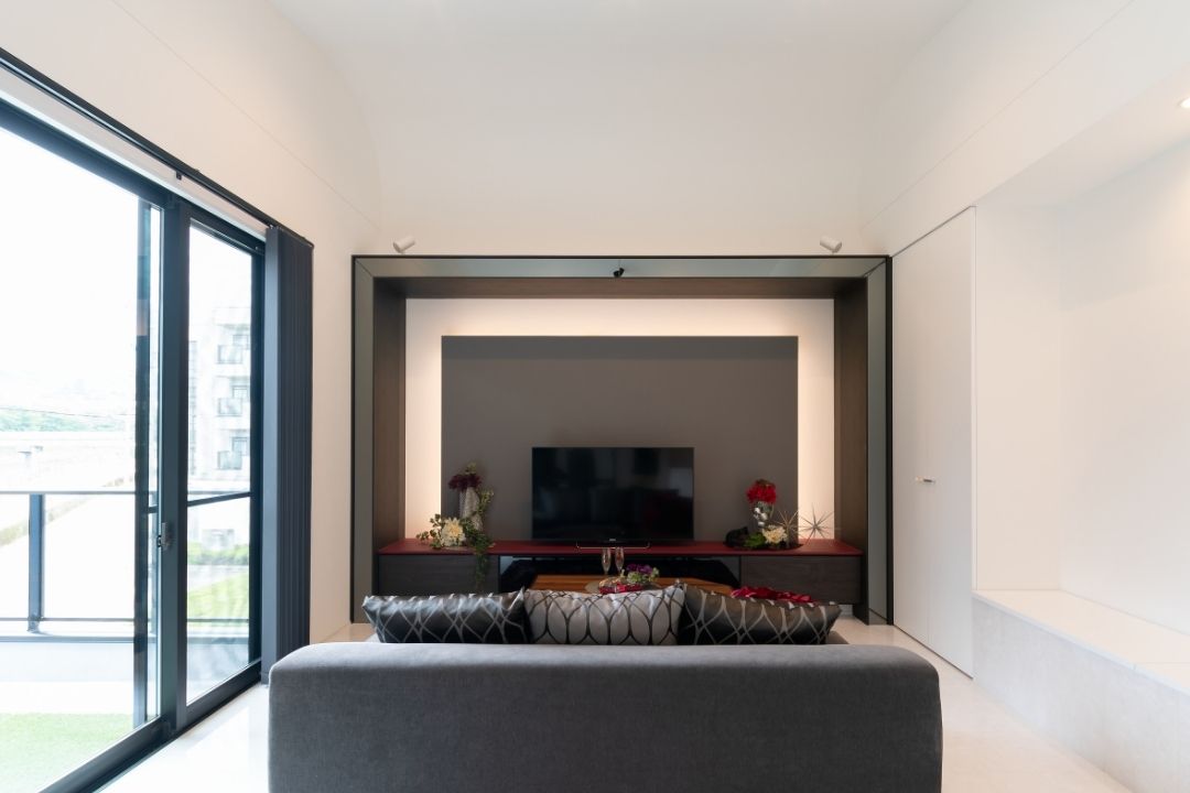 勾配天井で空間に広がりを感じるだけではなく、TVボード側の天井と壁の境目がアールになっているのが印象的。
