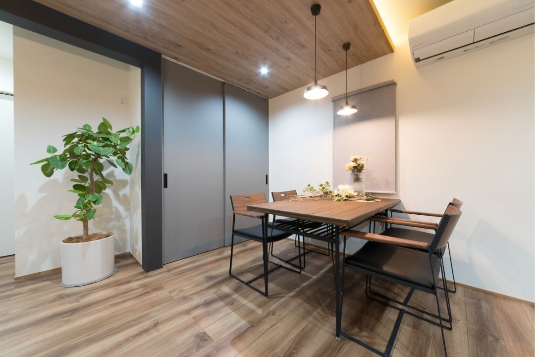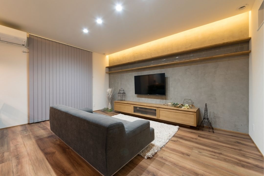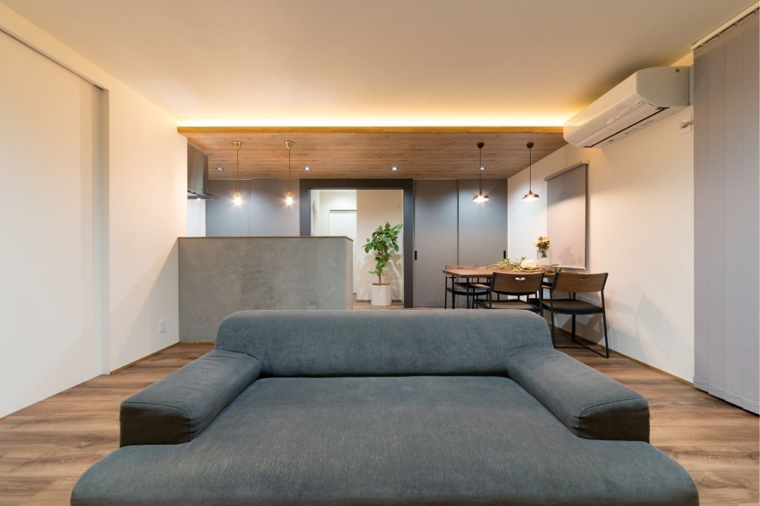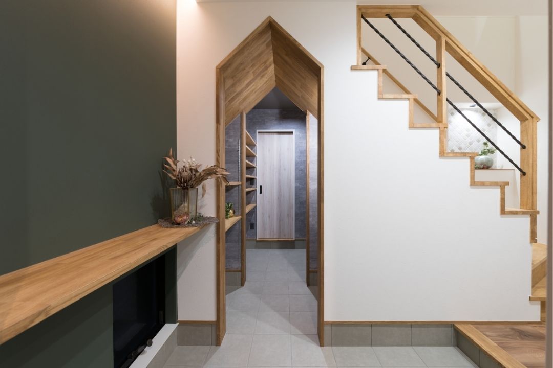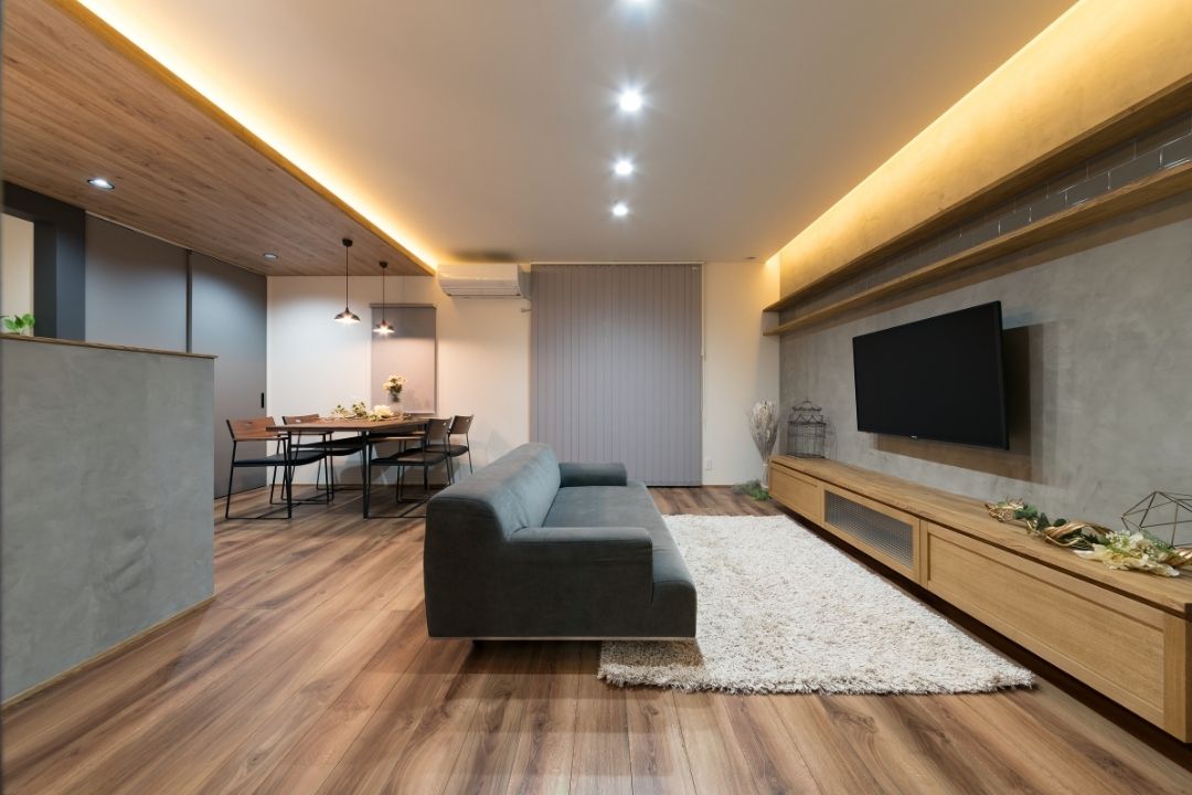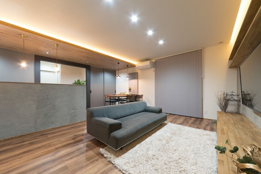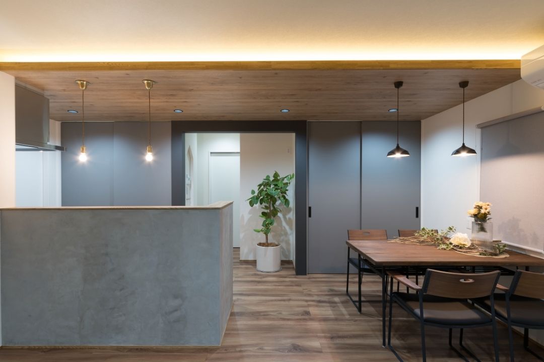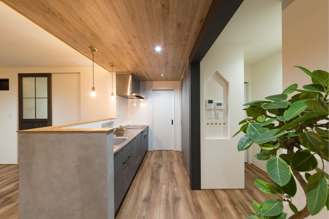 能美市山口町 N様邸 【極上のシンプルスタイル】 職人技が光るグレイッシュキッチン。 真鍮のランプが木の風合いをやさしく照らす、シンプルな中にもこだわりのある家。 一覧 navi < BACK NEXT >