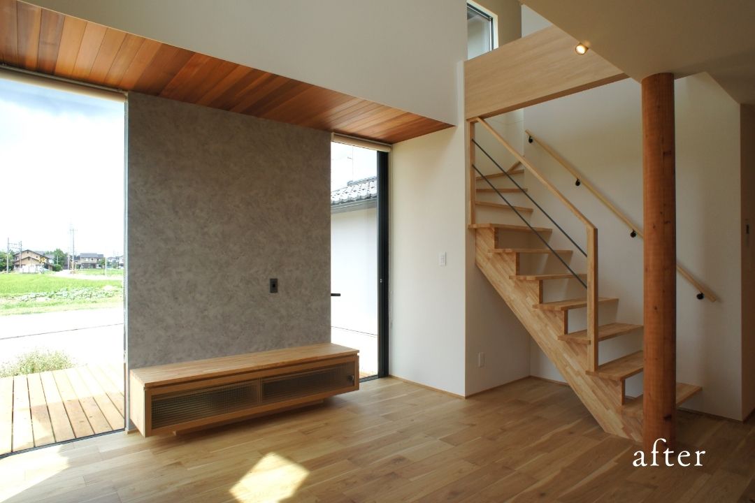 木の温もりが温かく家族を包み込み、爽やかな風を招く。