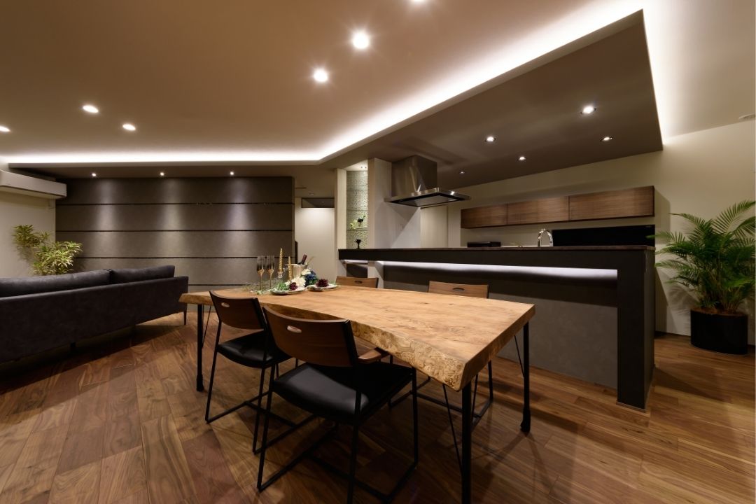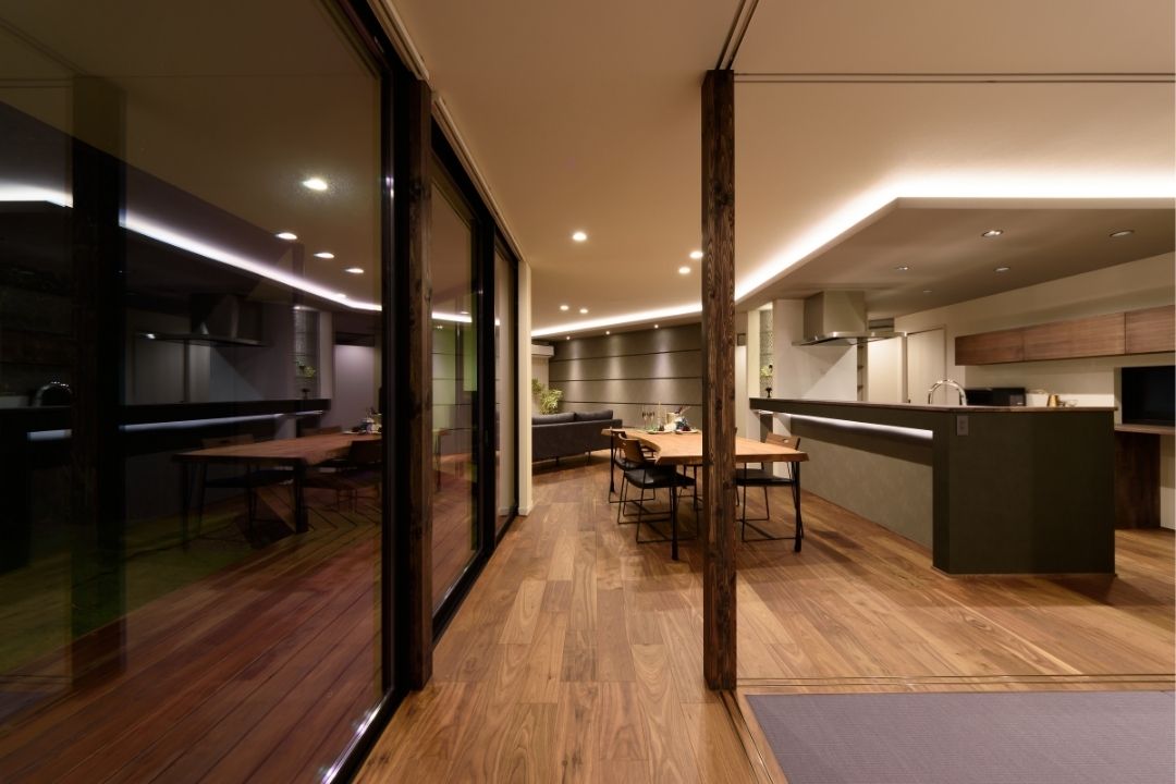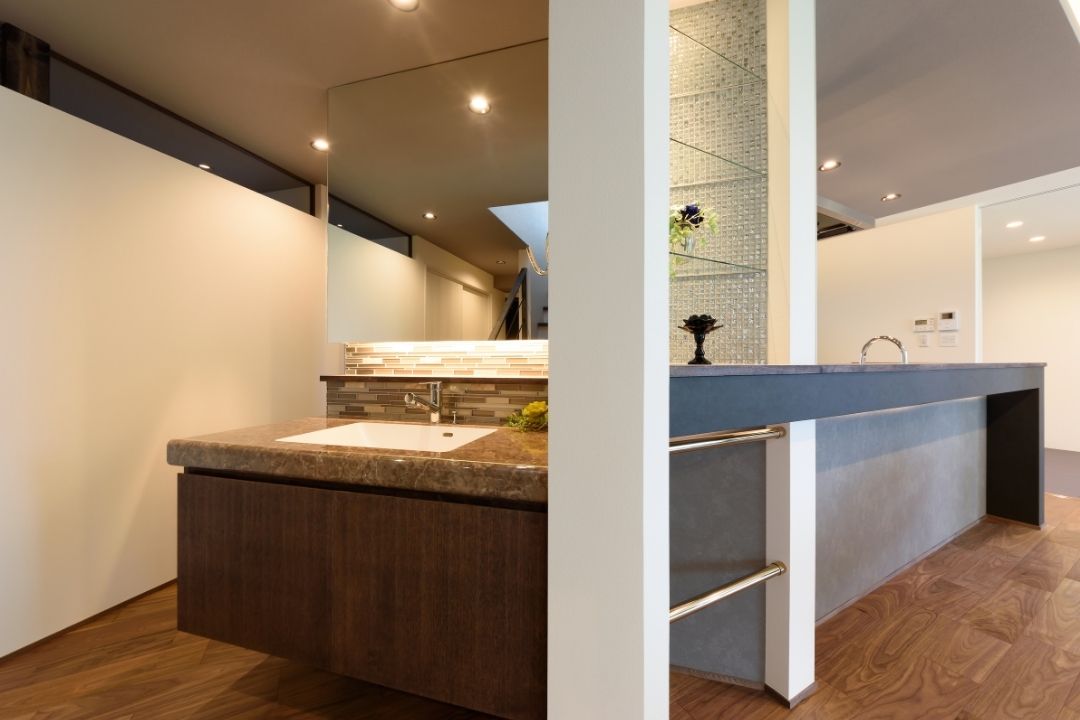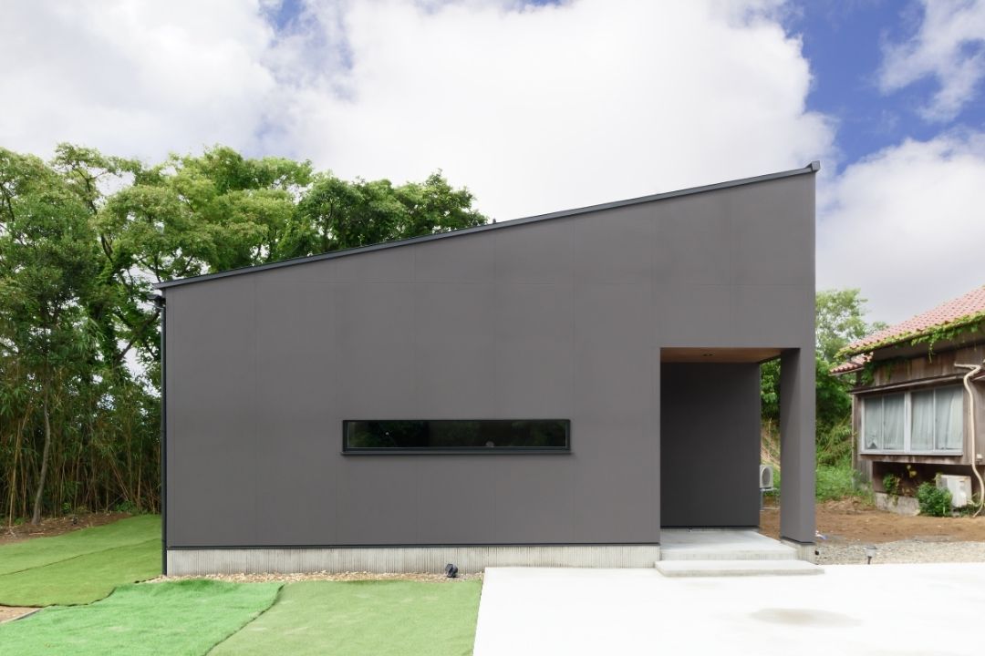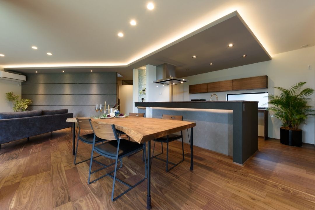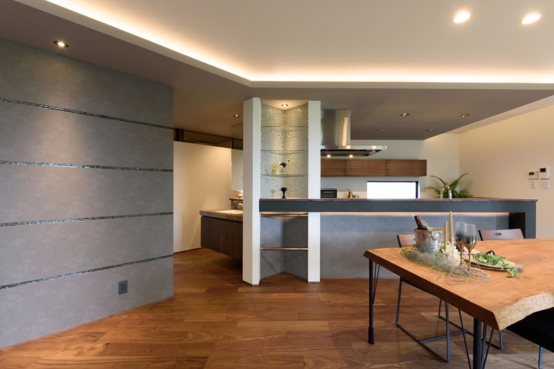 かほく市遠塚 Y様邸 【極上のグレイッシュモダン】 大人な雰囲気をまとうグレイッシュモダンデザイン。 ボーダータイルがアクセントとなり、リビングの壁を華やかに演出。 斜めに広がるリビングからそのまま出られるウッドデッキ。 一覧 navi < BACK NEXT >