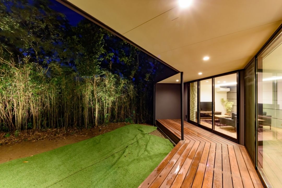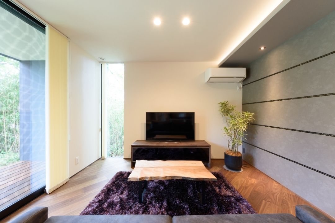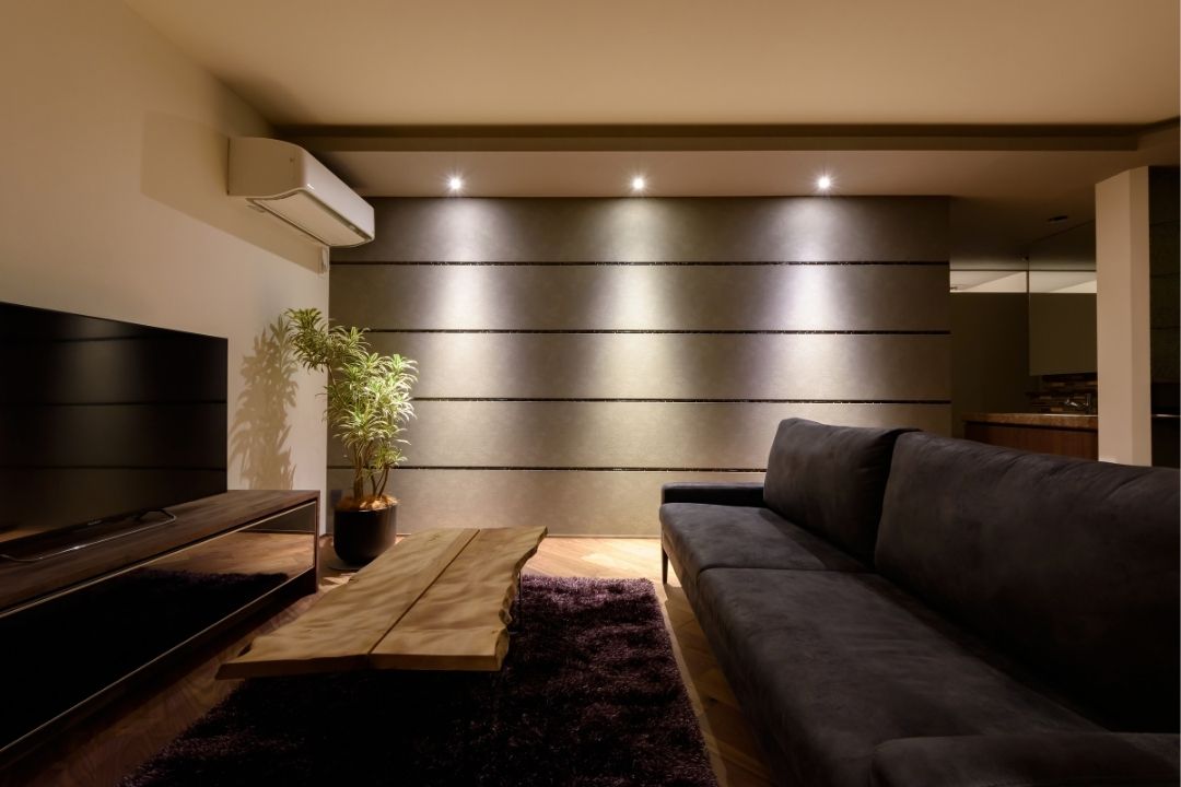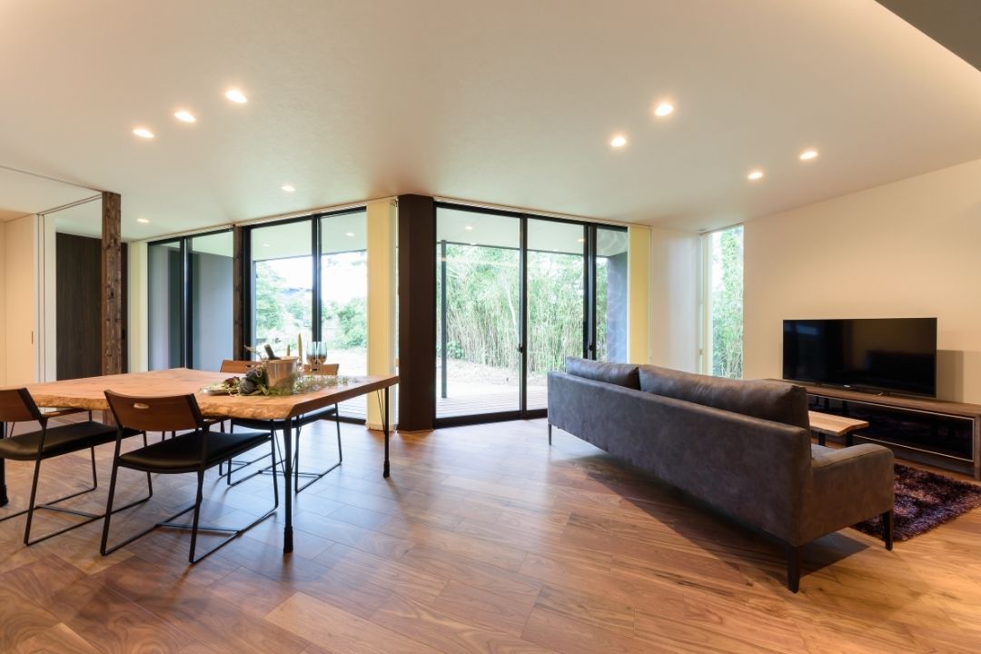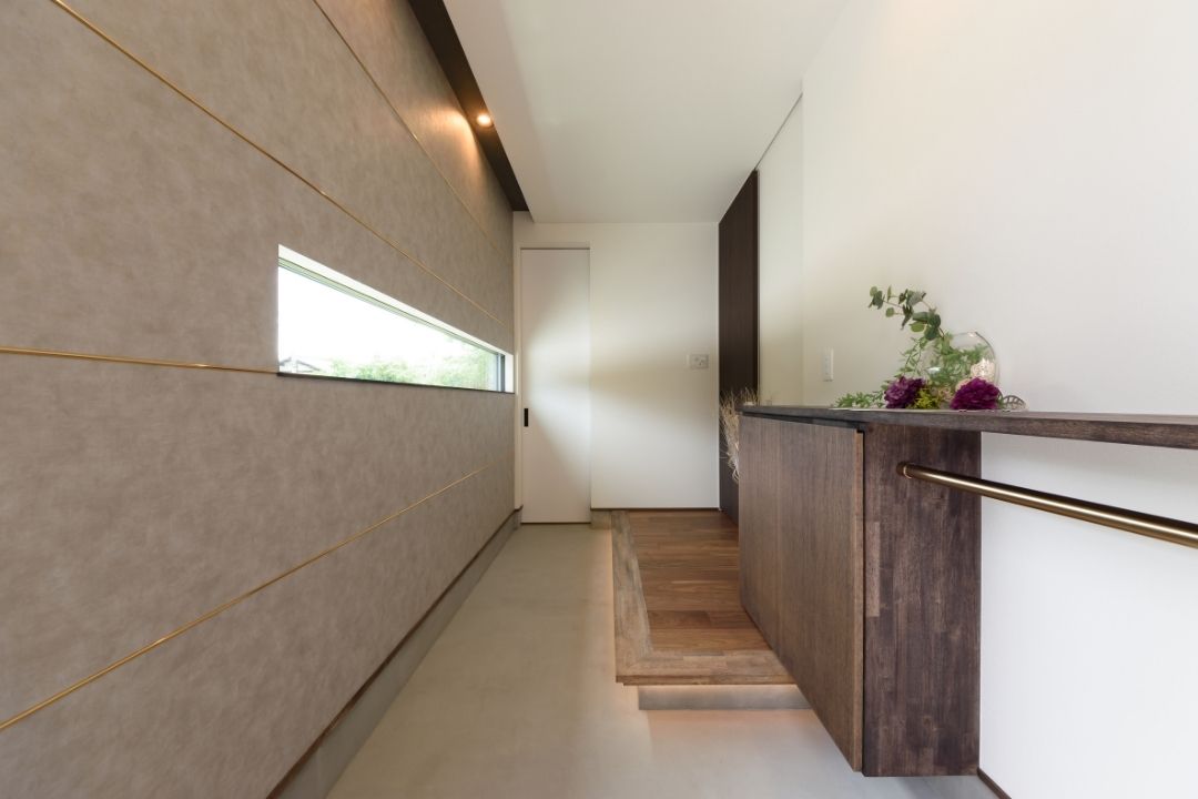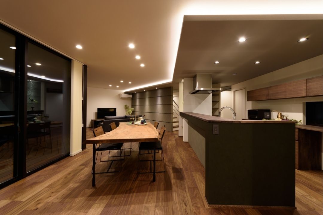 かほく市遠塚 Y様邸 【極上のグレイッシュモダン】 大人な雰囲気をまとうグレイッシュモダンデザイン。 ボーダータイルがアクセントとなり、リビングの壁を華やかに演出。 斜めに広がるリビングからそのまま出られるウッドデッキ。 一覧 navi < BACK NEXT >