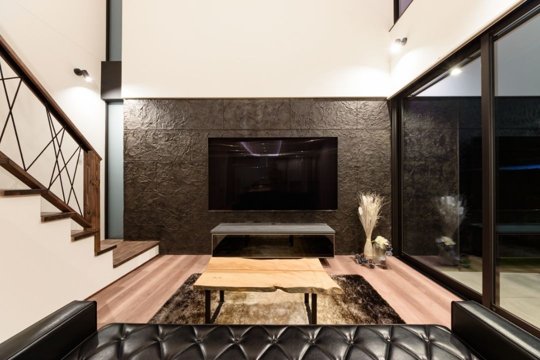 造形モルタルのテレビ面は空間にインパクトを与える。