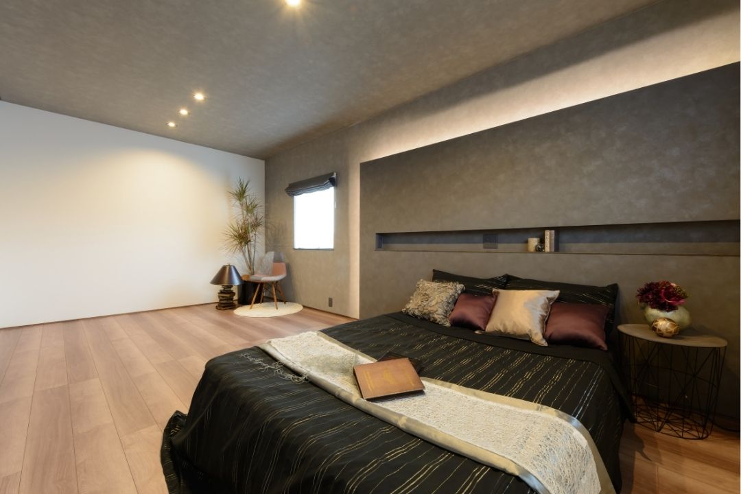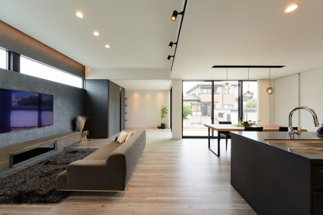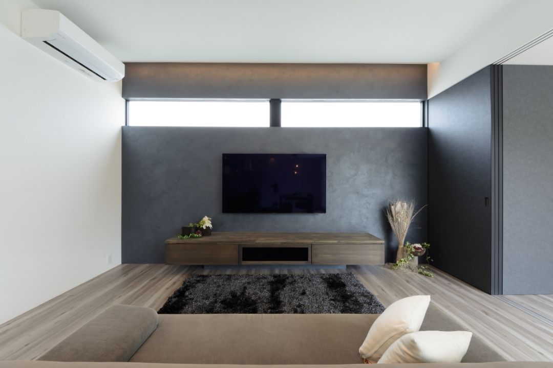 左官仕上げのTV面の壁が、モダンな雰囲気をより一層高めます。