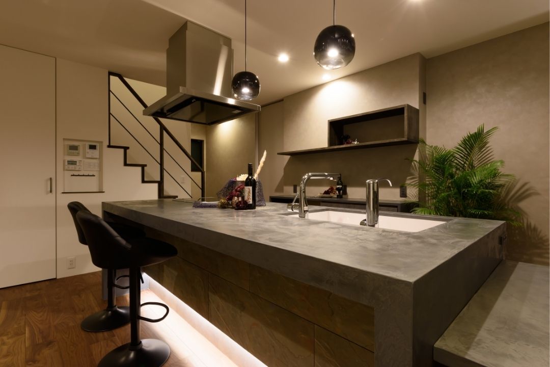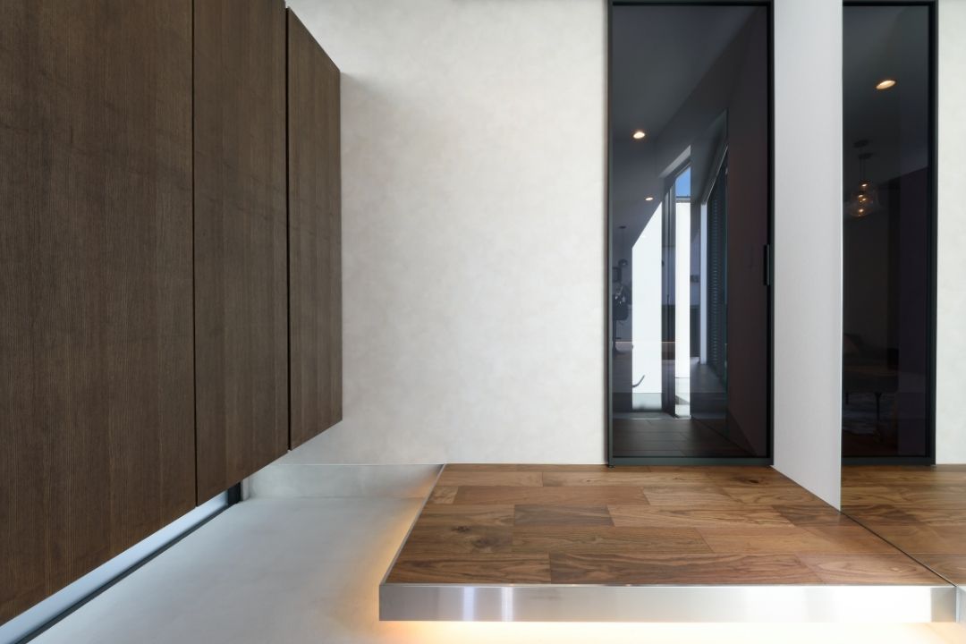ガルバリウムと左官仕上げの組み合わせが目を引くスタイリッシュな外観。