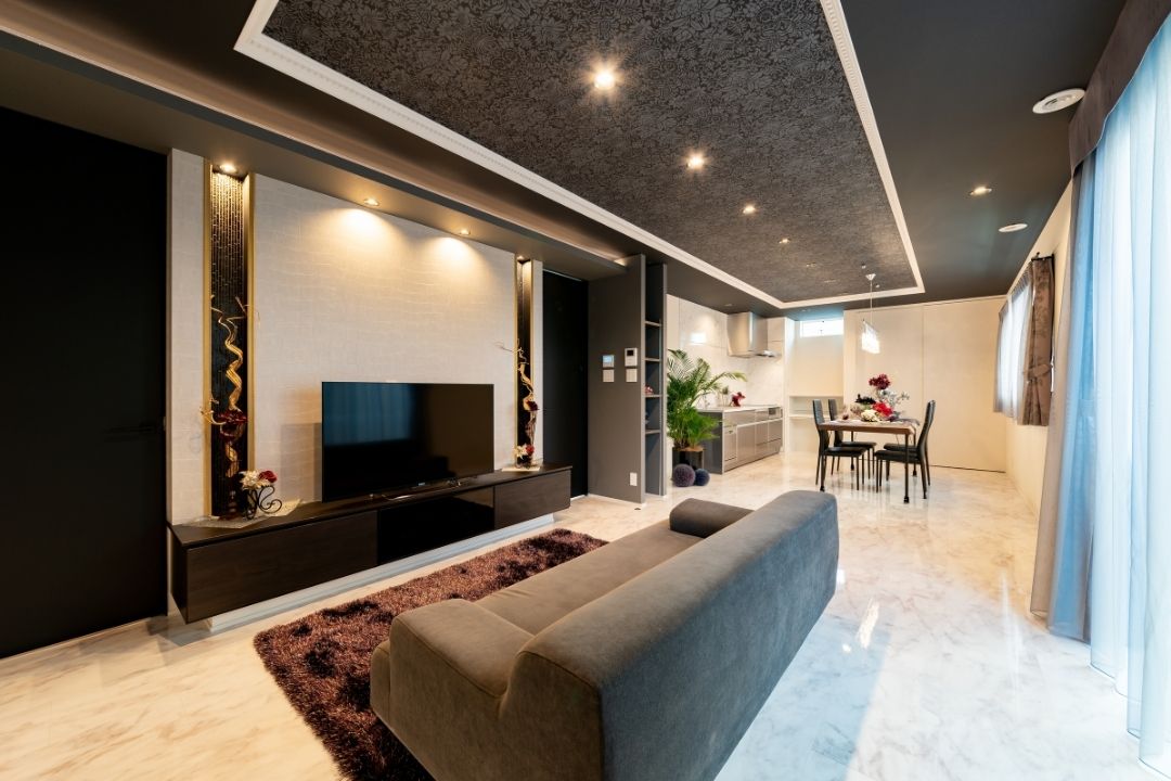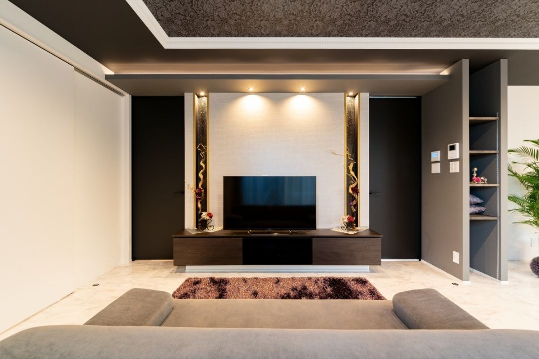造作テレビボードにゴールドの直線を合わせることで、唯一無二のインパクトのあるリビングを演出。