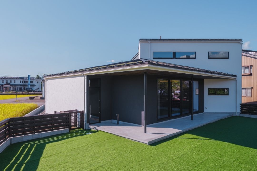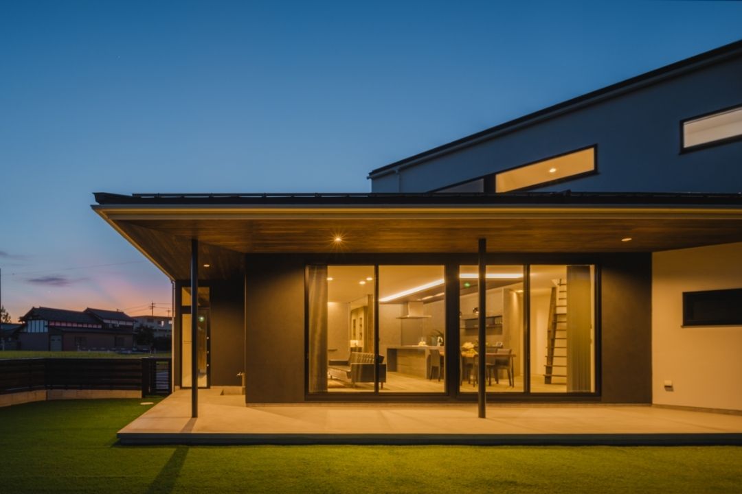 庭まで伸びる軒先がポイントなダイナミックな外観。